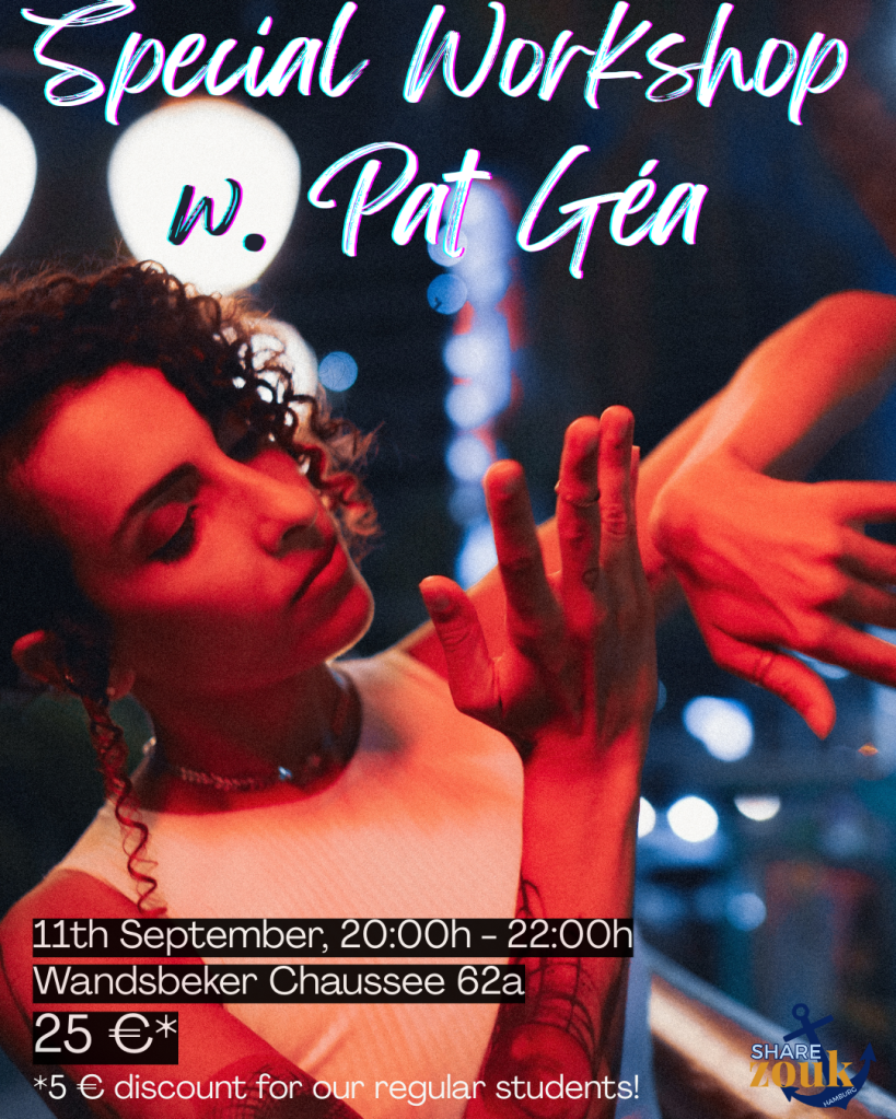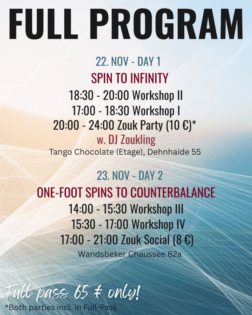 If you are already in town on Thursday, you can join our regular zouk practice in Wandsbeker Chassee 62 from 18:00h to 20:00h, and my zouk classes from 20:00h to 22:00h (Level UP! from 20:00h to 21:00h, and Zouk Basics from 21:00h to 22:00h, check the level description here: Local Classes).